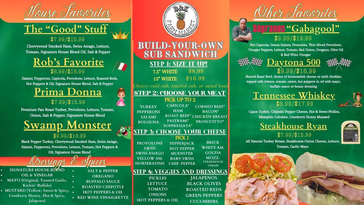 At B&K Farm Market, you can discover the perfect combination of flavors with our signature sub sandwiches or craft your own masterpiece. These sandwiches are made to order and freshly sliced with all of your favorite meats and cheeses on a locally baked Italian bun. Treat yourself to a delicious meal today!